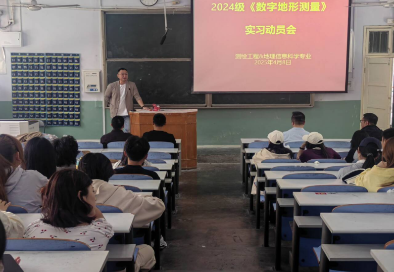 4月8日下午,bat365正版唯一官网在教三第一阶梯教室召开数字地形测量实习动员大会。党委副书记韩勇,实习实训中心主任范宝伟,测绘工程系主任林昊,专业实习指导教师沈毅,专业班主任时满星、李晨辉,以及2024级地理信息科学专业和测绘工程专业的60名本科生参加会议,会议由林昊主任主持。