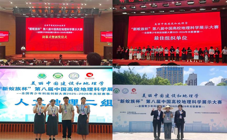 2025年7月25—27日,“新蚁族杯”第八届中国高校地理科学展示大赛总决赛于河南大学圆满落幕。本届大赛由中国地理学会、中山大学地理科学与规划学院主办,广东新蚁族文化发展有限公司冠名协办。经过激烈角逐,bat365四支入围决赛队伍凭借扎实的专业功底与出色的现场表现,最终全部斩获全国总决赛二等奖,bat365正版唯一官网凭借卓越成效的赛事组织工作,荣膺大赛“最佳组织单位”称号。