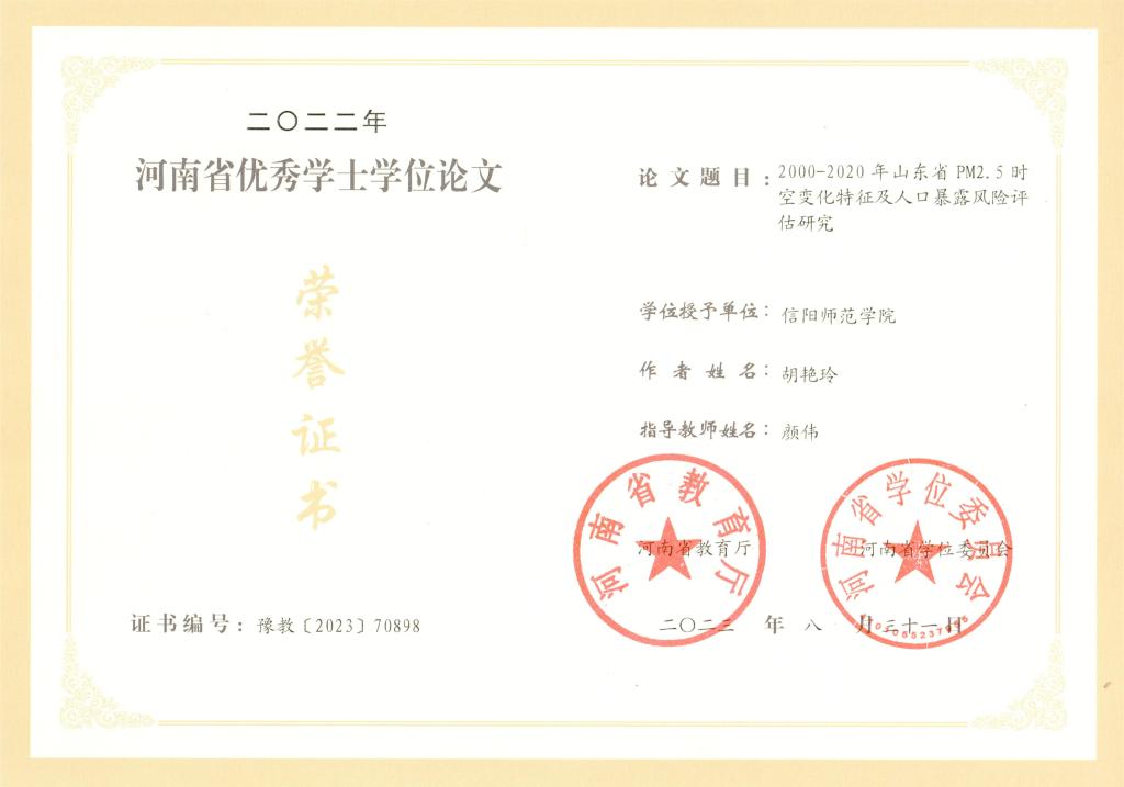 近日,河南省教育厅公布了2022年河南省优秀学士学位论文评选结果。bat3652022届地理科学专业胡艳玲同学的学位论文《2000-2020年山东省PM2.5时空变化特征及人口暴露风险评估研究》获得河南省优秀学士学位论文。指导教师为颜伟博士。