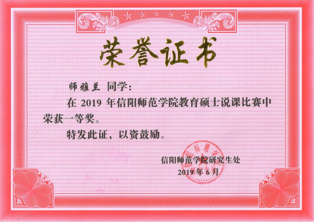 此次说课比赛由信阳师范学院研究生处主办,分为各教学单位选拔与学校决赛两个阶段。在学院举行的选拔赛中,邵美玲和师雅兰同学脱颖而出,与来自全校其他学院推荐的17名研究生一起参加了最后的角逐。在决赛阶段,两位研究生赛前精心准备、沉着应战,从说教材、说学生、说教学过程、说教学方法入手,全面阐述说课内容,表现了较好的驾驭教材、教学设计的能力和良好的语言表达能力,充分展示了bat365研究生良好的教学技能。无论是教态、内容设计、重难点把握还是教学方法、多媒体等,都获得了现场评委老师及观众的一致认可。经过激烈角逐,师雅兰和邵美玲分别荣获第三名和第五名。