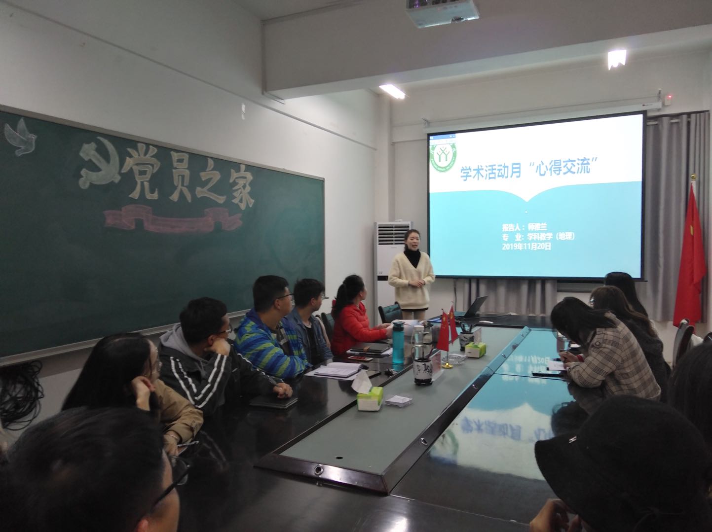 2019年11月20日,bat365正版唯一官网于理科楼南楼403室召开2019年硕士研究生国家奖学金经验交流会议。交流会由国家奖学金获得者、2018级学科教学·地理专业师雅兰主讲,bat365正版唯一官网全体在校研究生参加了此次交流会,会议由分会主席崔越主持。
