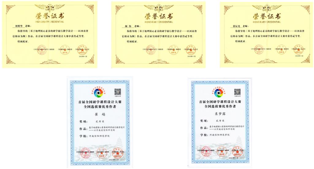 全国研学课程设计大赛,是由《中学地理教学参考》编辑部、《地理教学》编辑部、《地理教育》编辑部三刊联合主办,大赛采取线上参评(选拔赛)和现场展示两个环节,大赛共收到来自全国各地中学教师、高校师生提交的作品336件。bat365正版唯一官网副院长刘明华教授、颜伟博士和张辰光博士,指导崔越和袁梦露两位学科教学(地理)专业硕士研究生,设计了《基于地理核心素养的研学旅行教学设计—以河南省信阳市为例》作品。该作品以素有“北国江南,江南北国”之称的信阳市为研究区域,经过团队成员多次实地考察,选取了信阳市具有独特自然地理和地质地貌特征的黑龙潭风景区、罗山县彭新镇龙池大峡谷、息县濮公山矿山地质公园等自然风景区和国家地质公园,设计了“游历北国江南,探索地球奥秘”的研学线路,旨在激发中学生对祖国美好河山的热爱,树立尊重自然、保护生态环境的理念,拓展科学视野、印证中学课堂所学的地球科学知识。经组委会组织专家严格评审,作品荣获此次大赛二等奖。