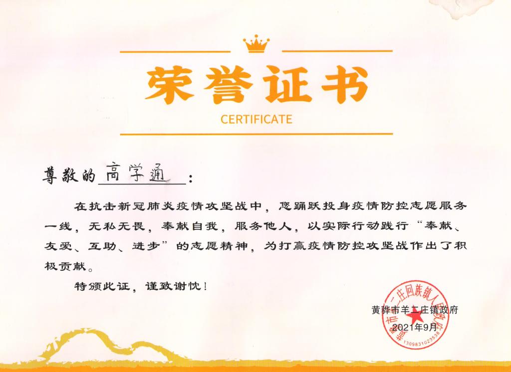自8月12日起,高学通同学深入抗疫一线,大力弘扬“奉献、友爱、互助、进步”的志愿服务精神,在疫情防控卡点值班,风雨无阻,坚守岗位。仔细检查来往车辆与人员流动,为返乡人员登记、扫码、测温;汇报整理防疫物资,配合村委做好疫情防护宣传,守护人民群众身体健康,为疫情防控做出了重要贡献。羊二庄镇人民政府对在疫情防控工作中表现突出的高学通同学同学颁发荣誉证书,并向信阳师范学院发来表扬信。