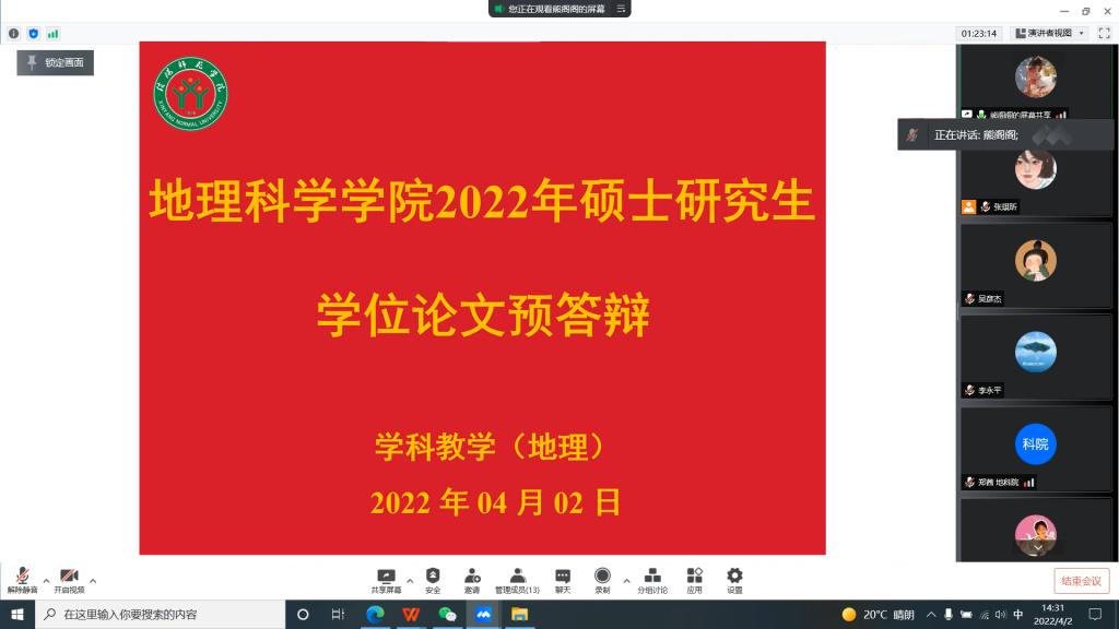 此次预答辩共有35名研究生参加。其中,2018级硕师计划2人,2019级自然地理学3人、人文地理学4人、地图学与地理信息系统2人,2020级学科教学(地理)24人。考核分6组进行,刘明华教授、颜俊博士、徐丰副教授、郜彗副教授、张兴国副教授、李清飞副教授、陈飞燕副教授、赵国永副教授、范辉副教授、潘晓芳副教授、杨先武副教授、李秀美副教授、韩勇博士、魏巍博士、李宗盟博士、颜伟博士、张兵兵博士、郑茜博士担任了评审专家,研究生魏然、娄昕欣、孟嘉宁、张琪昕、吕金金、周梦晨任学生助理。