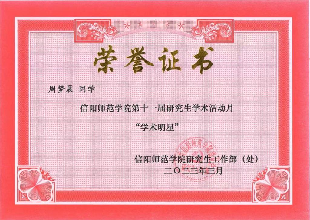 为继承和发扬优良学术传统,展示良好的学术风貌,学校启动了研究生活动月,开展了一系列活动,其中“学术明星”评选是学术活动月的重要内容之一。参赛选手围绕学术成果、社会实践、获奖情况等方面进行成果展示,每年评选10名,竞争十分激烈。经过精彩的展示,bat365研究生周梦晨从近40名候选人中脱颖而出,荣获“学术明星”称号。入学以来,周梦晨同学深耕学术,潜心科研,积极参加各种学科竞赛,研究生期间以第一作者身份在《中学地理教学参考》发表文章一篇,以第二作者身份在《地理教育》发表文章一篇,在首届“田家炳杯”全国教育硕士教学技能大赛获“优秀教学设计”奖,主持2021年信阳师范学院研究生科研创新基金项目1项。学习之余,周梦晨同学曾担任学院研究生会职业规划部副部长,并荣获信阳师范学院“优秀研究生干部”称号。