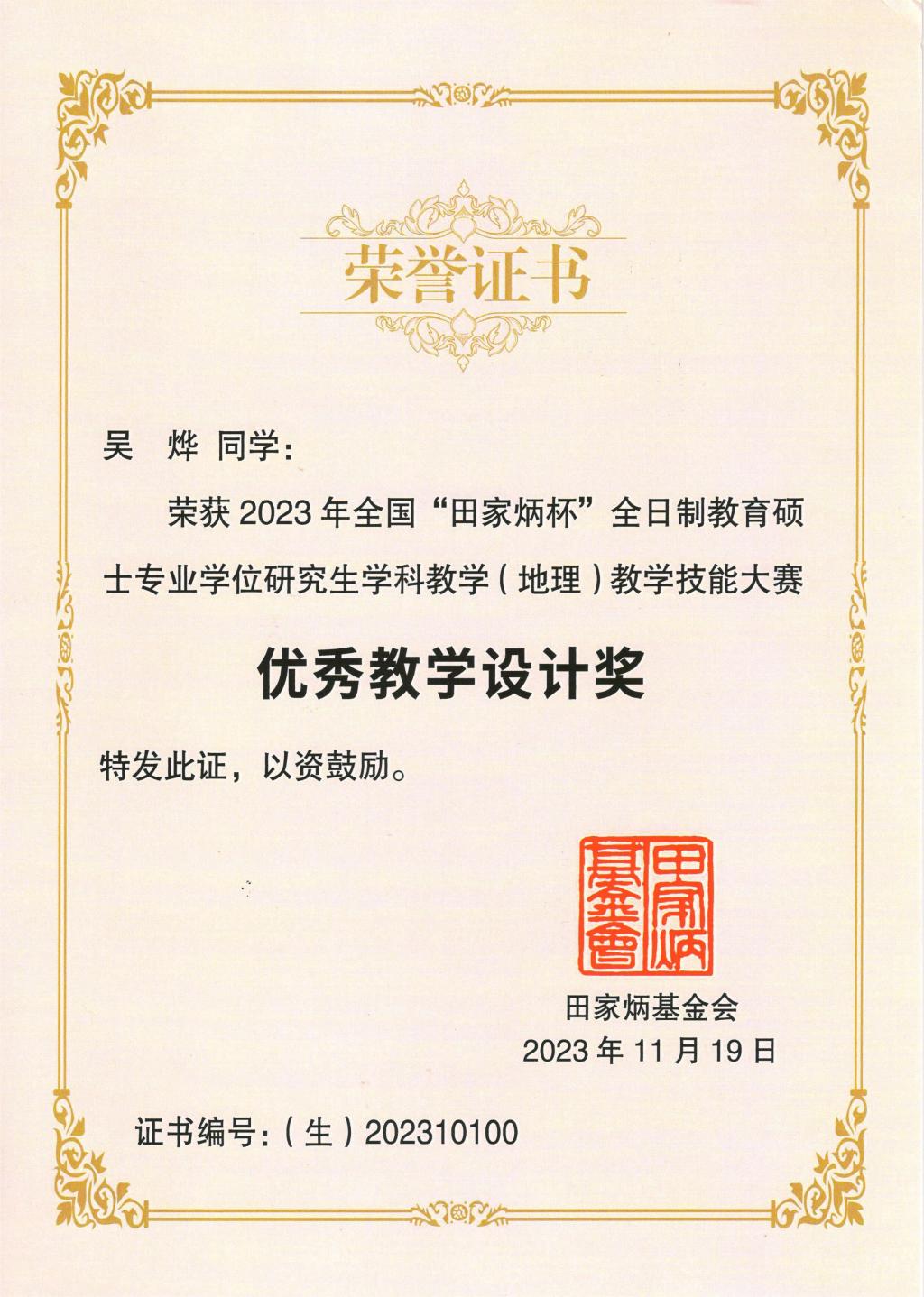 本次竞赛分为初赛和决赛两个环节。8月,吴烨同学在指导老师颜俊副教授的指导下提交录制作品,从众多作品中脱颖而出进入决赛。在决赛备赛过程中,颜俊副教授、张向敏博士、颜伟博士等针对吴烨同学的个性特点进行多次专业指导,启发选手从教学设计方法、即时演讲策略、地理本质挖掘和逻辑链条搭建等多个方面进行体悟与提升。在决赛中,吴烨同学凭借扎实的专业素养,通过90分钟现场备课、模拟授课与现场答辩等环节的精彩表现,荣获优秀教学设计奖。