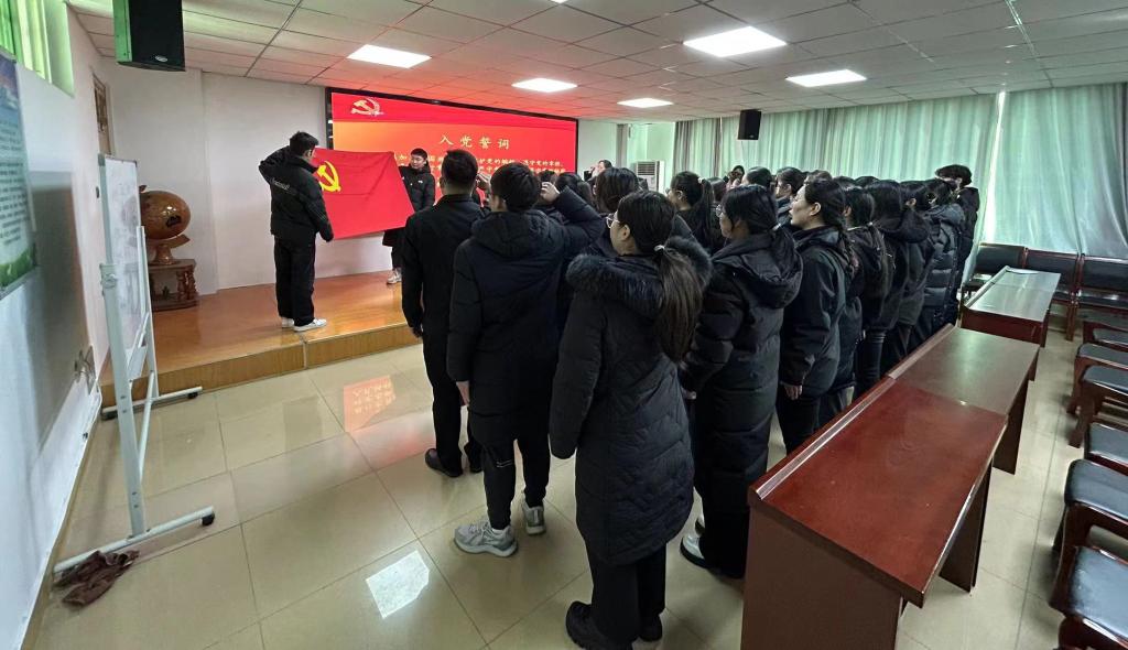 入党宣誓大会在庄严的《国际歌》中正式拉开序幕,全体党员在雄浑昂扬的旋律中起立肃穆。随后,在场全体党员高举右拳,面向党旗,在领誓人姚玉坤的带领下,庄严宣誓。铿锵有力的誓言响彻大厅,宣示了新党员们坚定不移的政治信心和矢志奋斗的坚强决心。而后,新发展党员代表孙梦雅发言,表示将全面提高自己的思想政治修养,严格要求自己,虚心向其他党员同志学习,牢记入党誓词和共产党员的初心使命,用实际行动践行入党誓词。