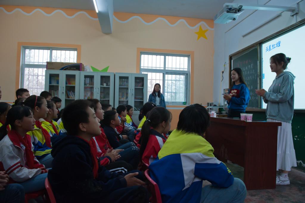 活动开始,三位参与志愿服务的成员为雷山小学的学生们轮流授课。首先,志愿者向学生们讲述课程《走进大别山》,介绍大别山的地理位置与相关历史知识,加强了学生们对红色革命历程的认识。接着,志愿者们教唱《歌唱祖国》与《五星红旗我们爱你》,学生们跟着节奏大声歌唱,唱出了祖国新生代的力量。在课堂结束后,志愿者们各自和学生们搭档进行户外素质拓展活动。每个志愿者和与自己搭档的学生进行了“萝卜蹲”游戏,学生和志愿者们在交流中渐渐熟悉,默契在谈笑中渐渐产生,他们在口令中同时蹲下站起。嬉笑声中,志愿者和学生们连成了一个整体,天空中飘着的小雨遮挡不住温馨的气氛。分发书本的环节,在志愿者的陪伴下每个学生拿到了自己中意的笔记本,学生们嘴上挂起了满意的笑容,体现了当代大学生与少年学生之间的密切联系,两者的发展促进现代人才的进步。最后,志愿者与同学们进行合照,并留下自己的联系方式以便未来能和学生们增进交流,保持长期联系。