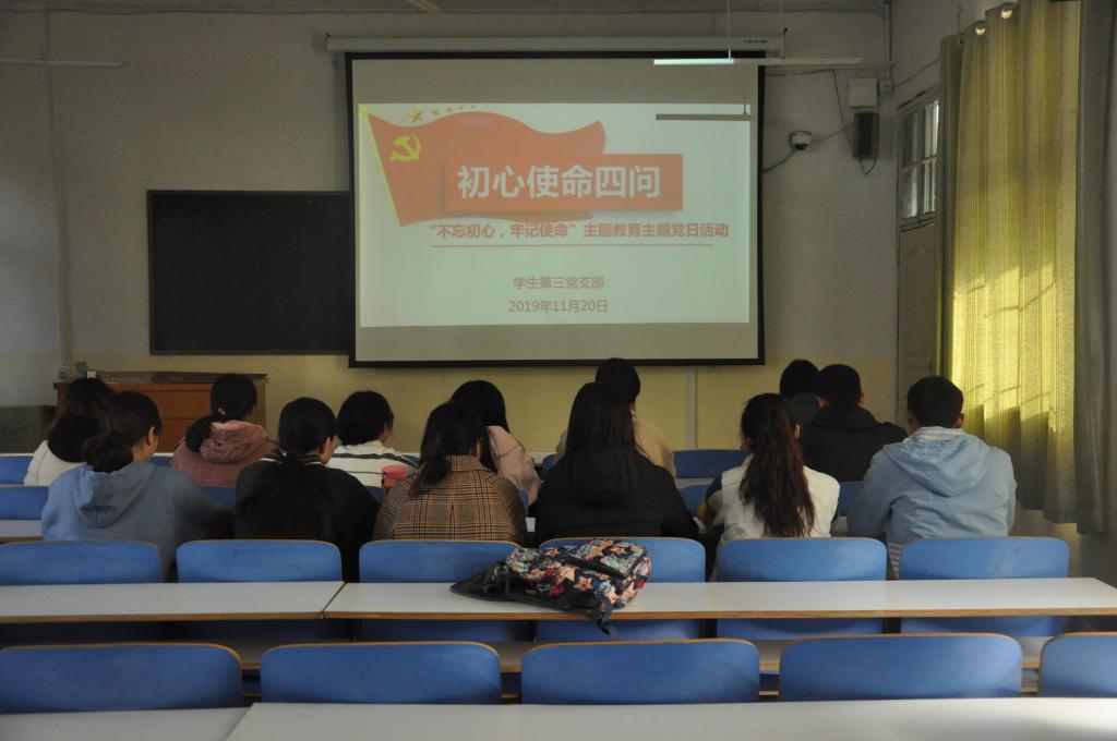 为进一步推进“不忘初心,牢记使命”主题教育活动,11月20日,bat365正版唯一官网学生第三党支部于教三04召开“初心使命四问”主题党日活动,学生第三党支部书记杨辉及支部全体党员参加此次活动。会议由杨辉主持。