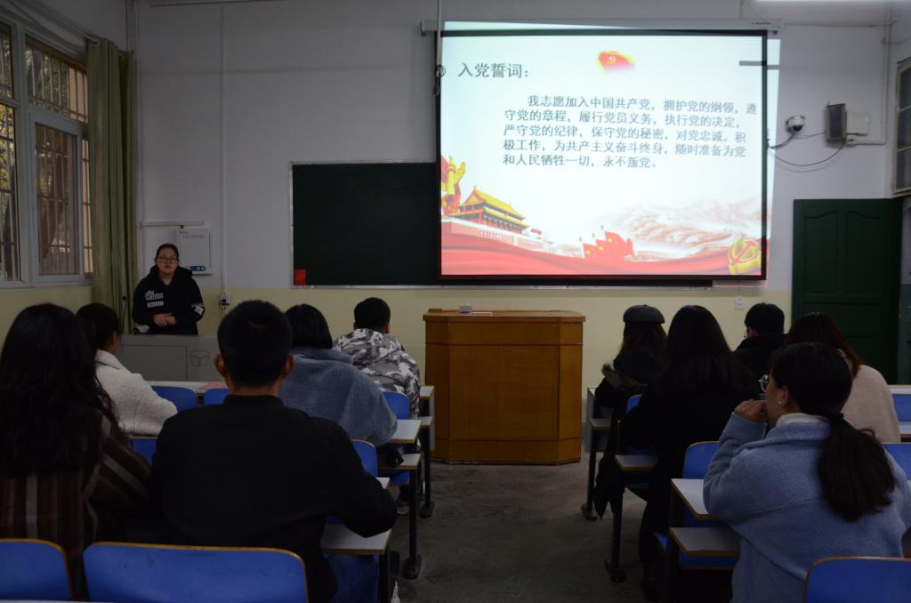 大会主要讨论关于王志鹏等5名同志能否发展为预备党员问题。会议第一项,姚玉坤对会议内容和主要流程作简要阐述并宣读发展名单;第二项是发展对象宣读《入党志愿书》,并向党组织汇报自身对党的认识、入党动机、个人经历以及在校表现等;第三项是入党介绍人介绍发展对象的思想、学习、生活、工作情况;第四项是支委会报告政治审查情况。与会党员充分讨论及采取无记名投票方式进行表决。姚玉坤宣布,王志鹏等5名同志基本符合党员条件,大会一致同意接收王志鹏等5名同志为预备党员。会议最后,党员张欣怡带领全体党员面对党旗进行庄严宣誓。新接收的预备党员表示定当不忘初心跟党走,在今后的学习工作中,坚定信念、严格要求自己,努力对现有不足做出整改,积极向优秀共产党员学习,发挥先锋模范作用,争取早日成为一名正式党员。