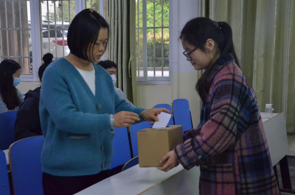 崔依琳宣读了《中共信阳师范学院bat365正版唯一官网各支部委员会选举办法》(草案),大会表决通过了选举办法(草案)和监票人、计票人名单;王怡同志宣读了新一届党支部委员会委员候选人简介。之后,按照组织程序和选举办法,支部全体党员以无记名投票方式,选举产生了由杨辉、李东东、林飞、崔钰争四名同志组成的新一届支部委员会。大会在雄壮的《国际歌》歌声中圆满落下帷幕。