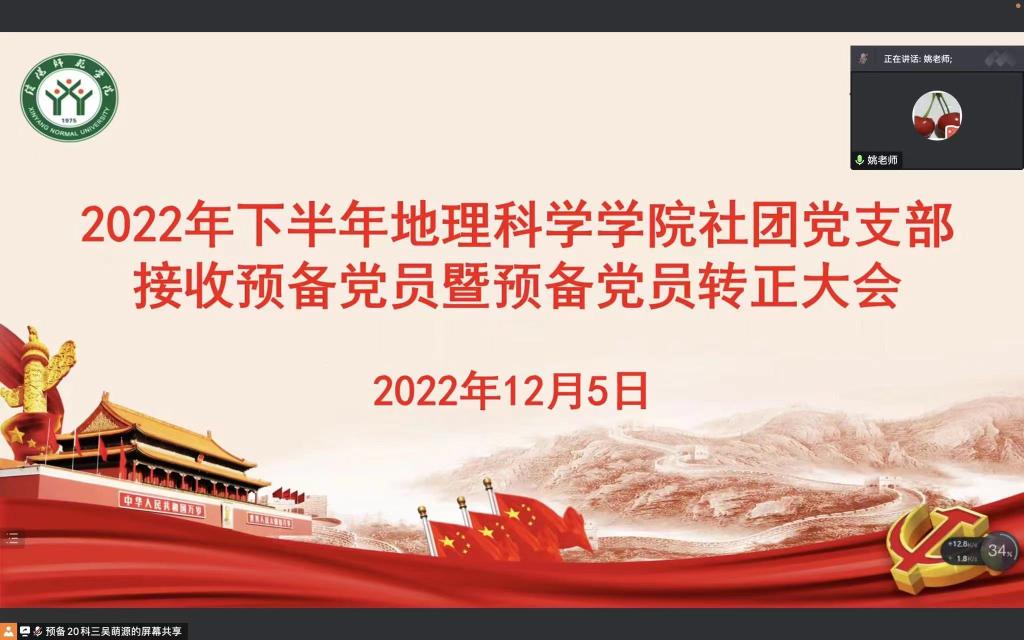12月5日,bat365社团党支部2022年下半年接收预备党员暨预备党员转正大会于线上顺利召开。支部书记姚玉坤,支部全体党员和2022年下半年发展对象共同参会,会议由姚玉坤主持。