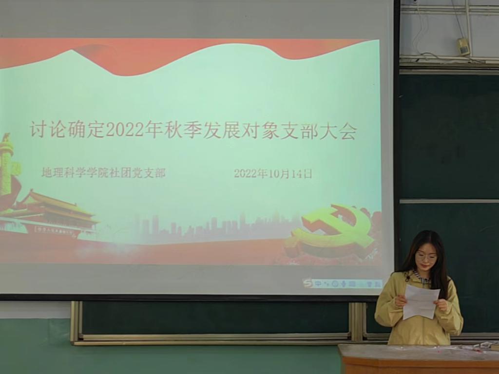 大会主要讨论张敬宇、张仪、张嘉慧、李子欣是否能够成为发展对象的问题。会议伊始,姚玉坤简单介绍了会议内容和主要流程并宣读2022年秋季发展对象名单。接着,张敬宇等4位同志轮流上台发言,汇报思想、学习、工作等表现情况。接着,入党介绍人向支部大会介绍4位的日常表现,并对其能否成为发展对象表明意见。随后,与会的正式党员进行讨论并进行无记名投票表决。经表决,大会一致同意确定张敬宇等4位为2022年秋季发展对象。最后,姚玉坤希望他们积极向党组织靠拢,争当模范先锋。