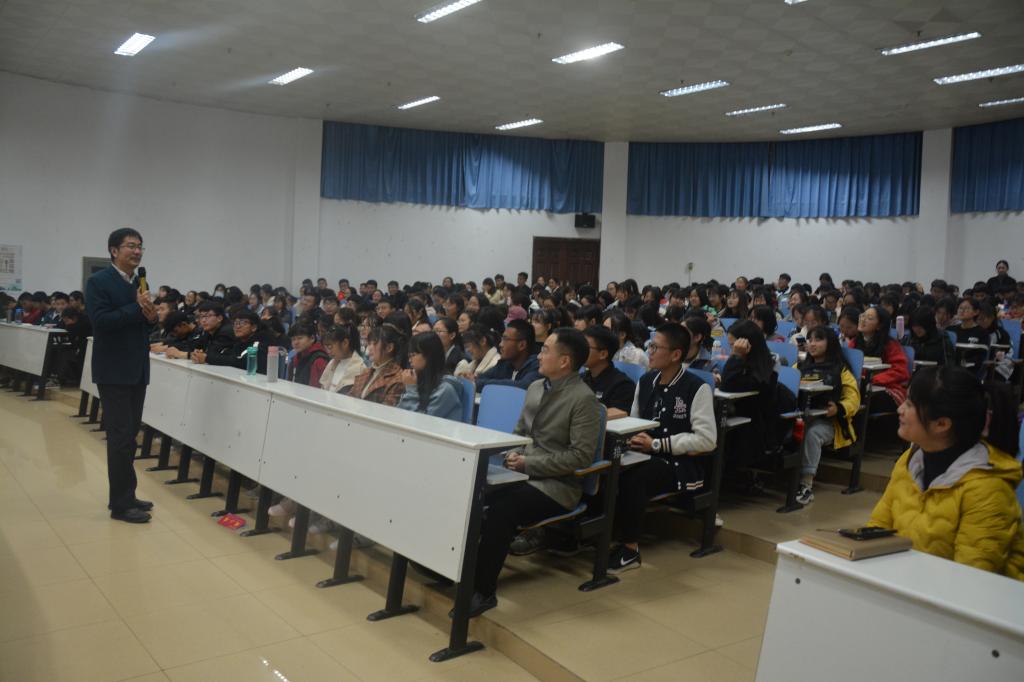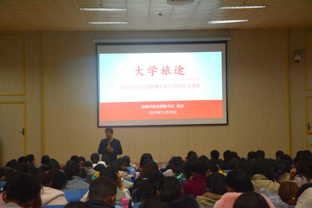 11月20日,传媒学院党委副书记胡波应邀于人文楼报告厅为bat365及外国语学院2019级新生团校授课。bat365正版唯一官网团委老师曹鹏鹏,外国语学院党委副书记柏孟仁、团委书记孔宪巍及两院2019级学生一同参加此次活动。活动由柏孟仁主持。