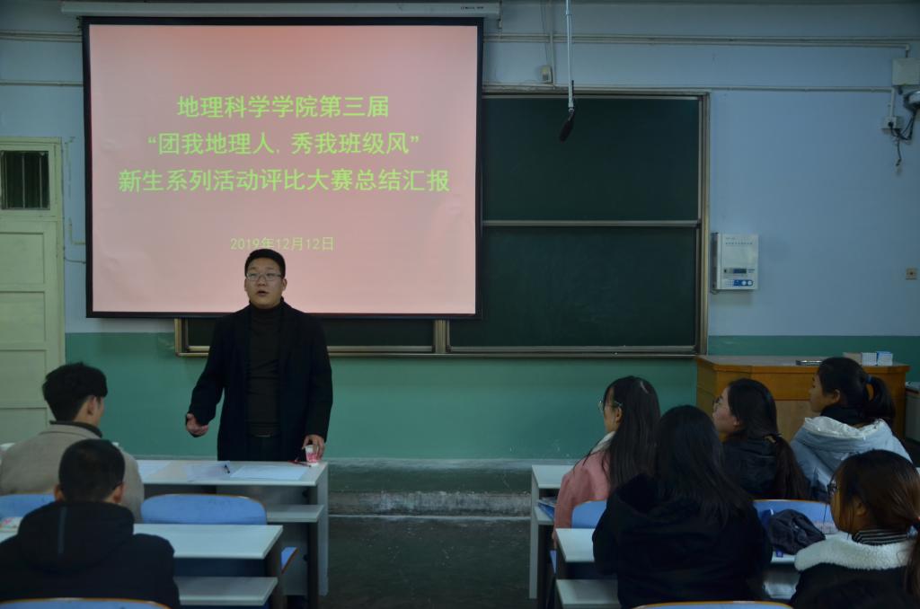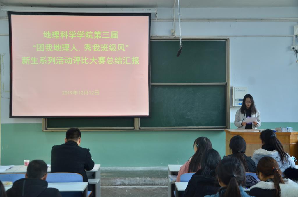 12月12日,由bat365正版唯一官网团委学生会主办的第三届“团我地理人,秀我班级风”新生系列活动评比大赛总结汇报活动于教二梯二顺利举办,bat365正版唯一官网团委老师曹鹏鹏、学生会主席朱浩东及主席团其他成员出席本次活动并担任评委。活动由学生会办公室成员徐倩倩主持。