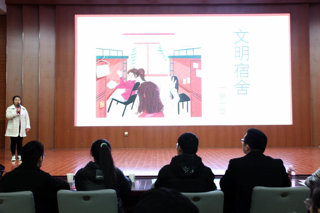 此次决赛分为文明寝室评比和最美寝室长评选两个环节。主持人简单介绍了评分细则后,比赛正式拉开序幕。各寝室的讲解员通过精心制作的PPT分别从宿舍布局、舍名舍徽、成员组成、日常活动、未来规划五方面来介绍自己的寝室及寝室成员,令到场观众对其寝室的设计布局有了深入了解。22号公寓613宿舍的讲解员通过快闪视频向在场观众分享室友之间的相处之道,其乐融融的宿舍氛围极富感染力。一舍142宿舍的PPT内容详实,充分展现了其宿舍的特色与魅力。期间,娓娓动听的歌曲《像鱼》、绘声绘色的小品《祝你幸福》轮番上演,给在场观众带来了一场视听盛宴。最终,22号公寓601宿舍荣获一等奖,一舍142宿舍秦轲鑫等五名寝室长获得最美寝室长称号。曹鹏鹏为获奖人员颁发证书并作总结性讲话,指出此次活动对于美化宿舍环境、促进室友关系的重要意义,并对我院文明宿舍建设与学风建设取得的成就表示肯定。