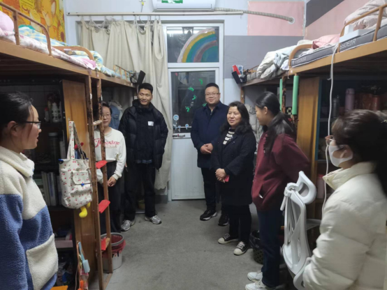 晚餐后,宋力一行深入学生宿舍,关心同学们近期的生活和学习状况,摸排宿舍安全隐患、检查宿舍卫生情况,鼓励合理锻炼、规范作息时间。以饱满的热情积极投入新学期的学习,营造良好的班风、学风、院风,展现当代大学生的良好精神面貌,在大学学习、生活中不断发展自我、成就自我。