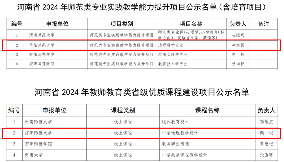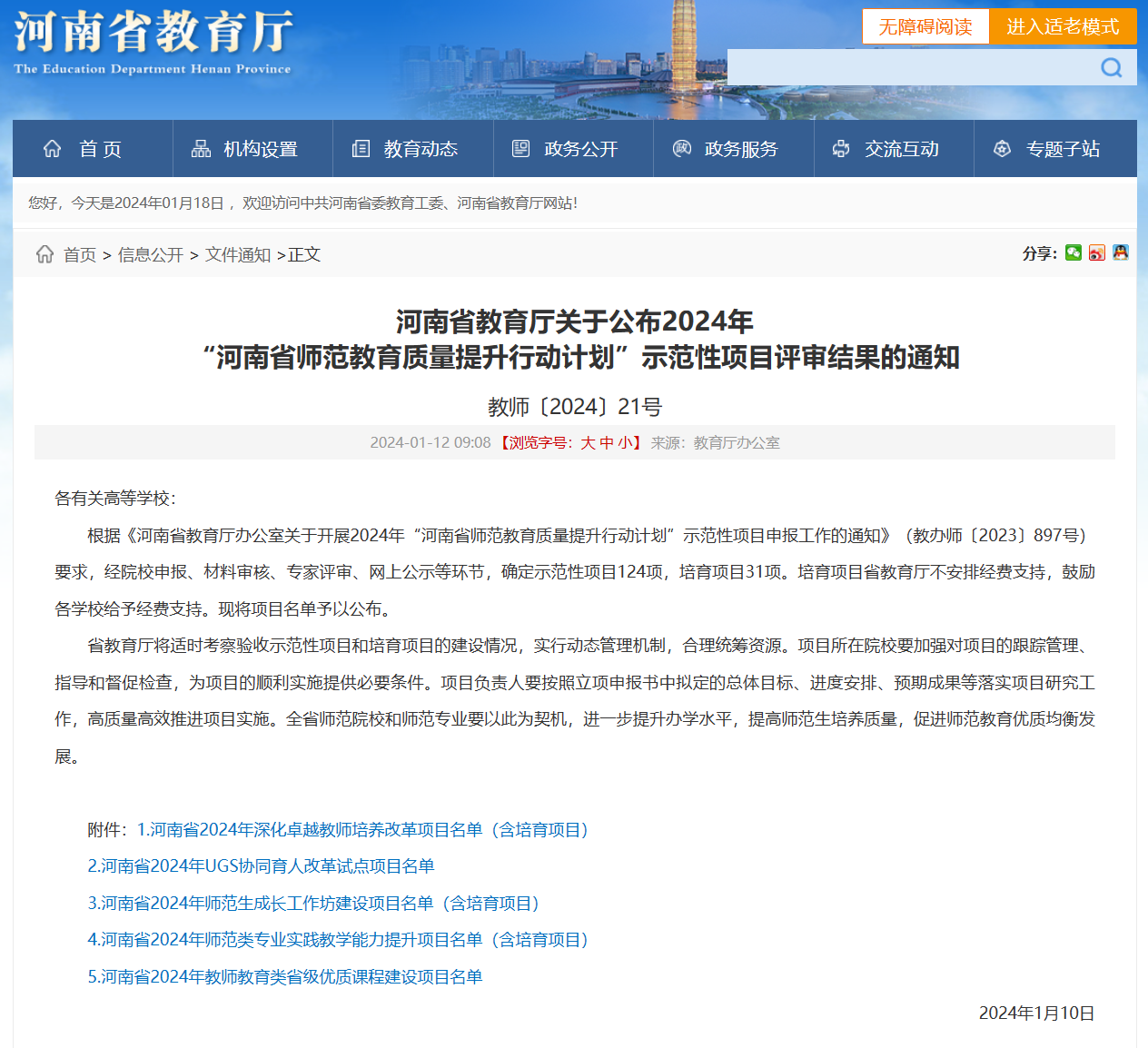 近日,河南省教育厅印发《关于公布2024年“河南省师范教育质量提升行动计划”示范性项目评审结果的通知》,学校共获批9项示范性项目,其中,bat365正版唯一官网获批2项,分别是师范类专业实践教学能力提升项目1项和教师教育类省级优质课程建设项目1项。
