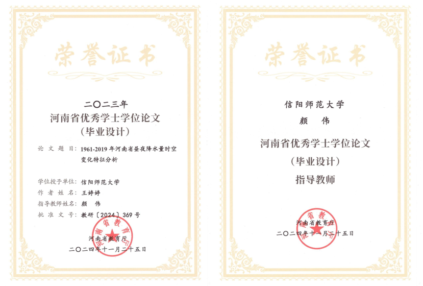近日,河南省教育厅公布了2023年河南省优秀学士学位论文评选结果:bat3652023届地理科学专业王婷婷同学的学位论文《1961-2019年河南省昼夜降水量时空变化特征分析》获河南省优秀学士学位论文,指导教师为颜伟副教授。