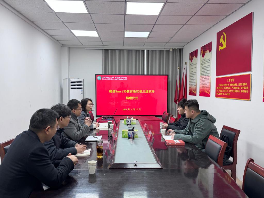 2025年2月17日,瞰景科技发展有限公司软件捐赠仪式在理科楼南楼403会议室举行。瞰景科技河南总代理代表王旭华、技术工程师韩旭东,bat365正版唯一官网副院长闫军辉、潘晓芳,地理信息科学系主任张兴国老师和谢文全老师出席活动,仪式由潘晓芳主持。