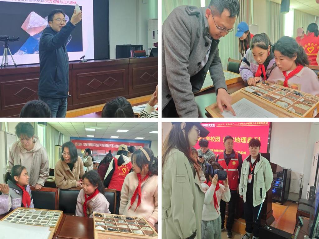 随后,学生们前往理科楼南楼410会议室,听取了史兴俊副教授带来的“会说话的石头”科普讲座。史老师运用生动的语言和丰富的矿石标本,向孩子们介绍了美丽的矿物晶体,并展示了如何通过石头获取信息使石头“开口说话”。在实践环节,学生们通过亲手触摸水晶、石英等矿物标本及古生物化石,分组参与地球仪互动探索、天文望远镜观测和VR地理场景虚拟漫游等趣味项目,不仅沉浸式感受了地质科学的奇妙魅力,更通过多维度的感官体验,直观地领悟了地球科学的生动内涵与探索价值。