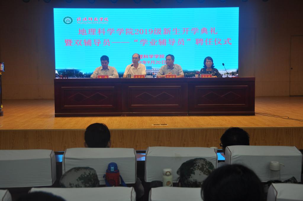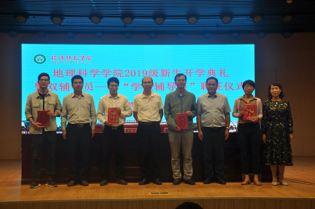 典礼伊始,牛继强为典礼致辞。他首先对新生的到来表示热烈欢迎,并简要介绍了信阳师范学院bat365正版唯一官网的历史、发展概况及师资力量等,并勉励同学们珍惜大学时光,希望他们在未来的四年里,能够时刻胸怀祖国,锐意进取,为学院发展提供动力。随后,教师代表潘晓芳发言,她结合自己的学习和工作经验为新同学提出建议,并表示全体教师会坚持以德育人,爱岗敬业,为人师表,真诚地关爱每一位同学。学生代表2017级人文地理与城乡规划班朱浩东,2019级地理科学一班王鑫颖,2019级硕士研究生崔越相继发言,结合自身情况,就对学习的理解和未来的展望发表自己的看法,他们的发言赢得了在座同学阵阵掌声。王义民简要介绍了bat365双辅导员制度,并宣读《bat365正版唯一官网双辅导员制工作实施细则》及2019级学业辅导员名单。接着,学院领导为2019级学业辅导员颁发聘书。
