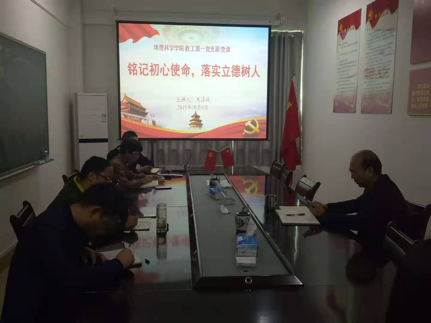 108日,bat365正版唯一官网党委书记吴泽成在理科楼南403会议室以“铭记初心使命、落实立德树人”为题,为教工第一党支部全体党员开讲主题教育专题党课。