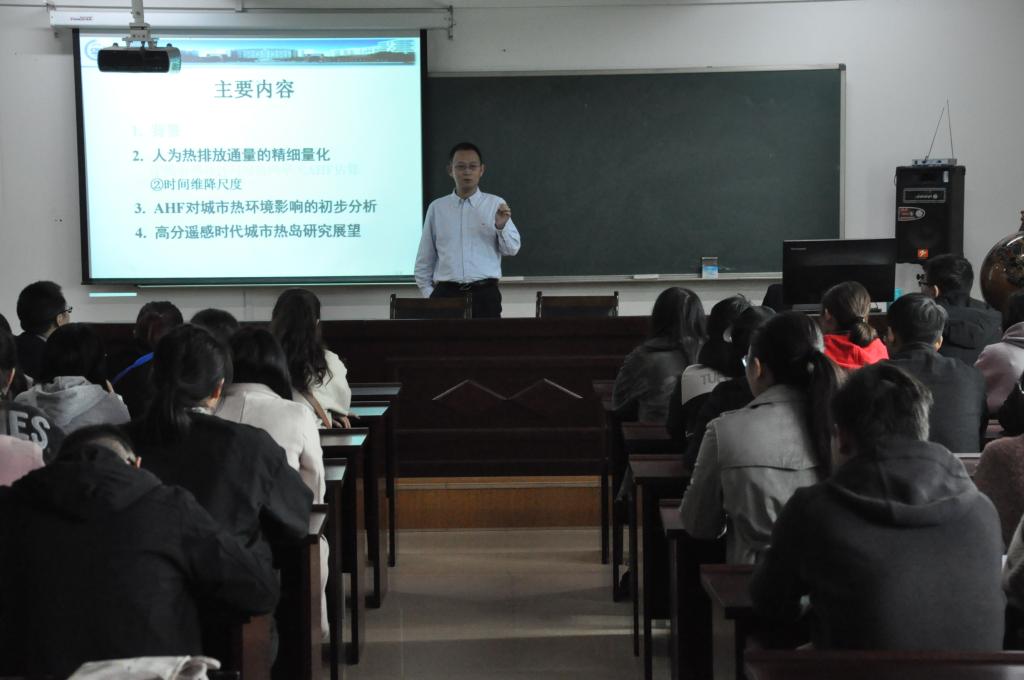 报告会上,胡德勇教授首先介绍了研究背景。全球范围内的快速城市化进程,使城市不透水地表增加,人为热排放加剧,导致了严重的城市热岛效应。热岛效应引起一系列复杂的“地表-大气”相互作用。接着,胡教授分别从人为热排放通量的精细量化、AHF对城市热环境的影响两方面,展示研究团队的最新研究成果,最后对高分遥感时代城市热岛的研究进行了展望。胡教授指出,在高分遥感时代,城市热岛遥感研究的机遇与挑战并行,未来应更多地考虑城区下垫面形态和结构特征,有效提升城区地表参数的遥感反演能力。张教授的报告气氛活跃,其渊博的知识和独到的见解,赢得了与会师生的阵阵掌声。交流环节,胡德勇教授不仅详细地回答了师生们的提问,还就本科生、研究生攻读首都师范大学硕士和博士学位等问题给出了中肯的建议。副院长高军波对胡德勇教授精彩的学术报告表示感谢,高院长指出,胡教授的报告起点高、结果与数据精度高,数据详实、成果扎实,语言朴实,与会师生受益匪浅。