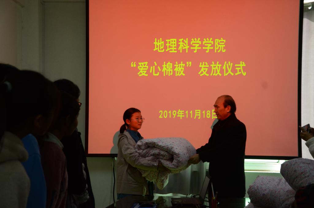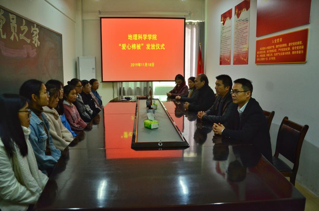 11月18日,bat365正版唯一官网“爱心棉被”发放活动于理科楼南楼403会议室温馨开展。bat365正版唯一官网党委书记吴泽成,副院长牛继强、王义民、刘明华,党委副书记朱伟,副院长高军波,团委老师艾甜甜、曹鹏鹏与二十余名受资助的同学一同参与此次活动。