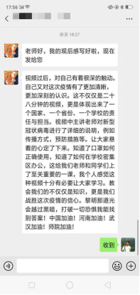 突如其来的新型冠状病毒性肺炎打破了正常秩序,抗击疫情成为当前头等重要的大事。“停课不停学”,体现了教育部门的责任担当:既把广大师生生命安全和身体健康放在第一位,也采取积极措施保障教育秩序和成效。作为2018级地理科学专业“双辅导员”的颜俊老师,不仅自己认真学习疫情防控知识,也给学生们准备了抗击疫情的四个内容的教育课,每个同学都写出了深刻的学习心得!