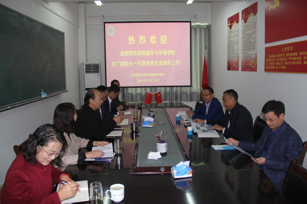10月29日下午,淮阴师范学院城市与环境学院院长毛广雄、副院长刘传明、院办主任王从盛一行来bat365考察交流,座谈会在理科楼南楼403会议室举行。bat365正版唯一官网党委书记吴泽成、副院长牛继强、王义民、刘明华、高军波及有关人员参加座谈会。会议由牛继强主持。