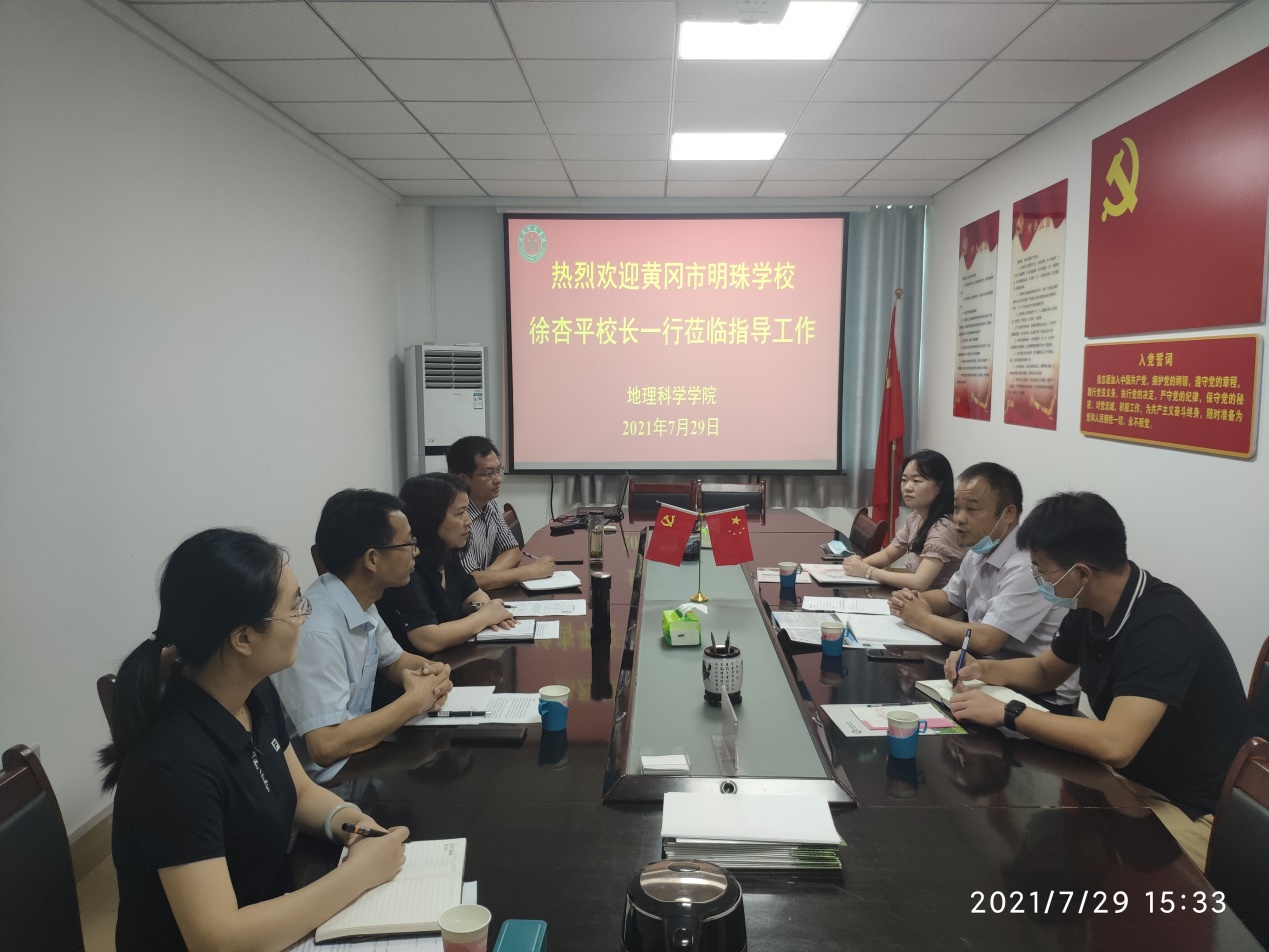 2021年7月29日,黄冈市明珠学校徐杏平副校长和卢哲老师来bat365访问交流,并对硕士毕业生孟苗苗进行考察。bat365正版唯一官网党委书记宋力、地理科学系主任颜俊、研究生工作秘书闫军辉和班主任郑茜参与座谈。会议由党委书记宋力主持。