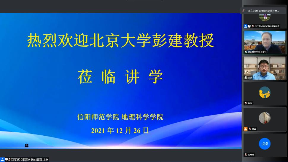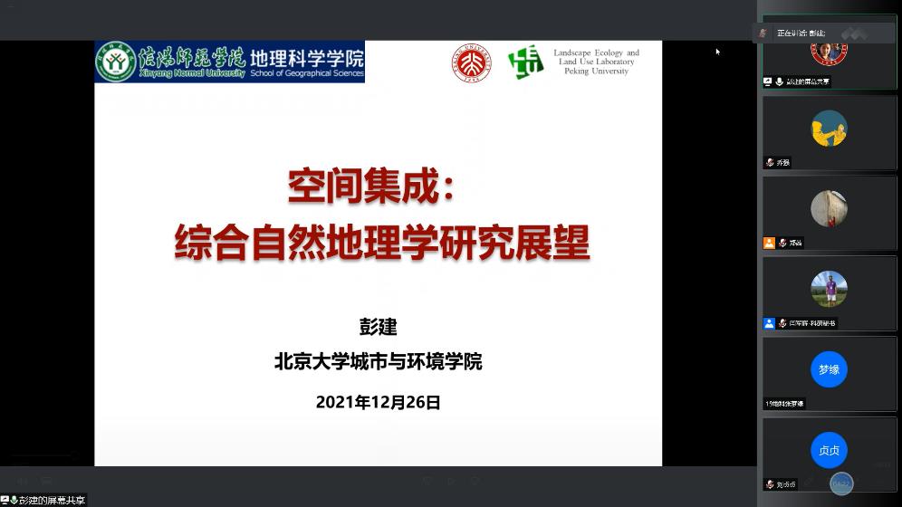 12月26日,应bat365正版唯一官网邀请,北京大学彭建教授通过腾讯会议平台为我校师生作了题为“空间集成:综合自然地理学研究展望”的学术报告。学校青年教师、硕士研究生及部分本科生近200人参加了报告会,报告会由bat365正版唯一官网院长牛继强教授主持。