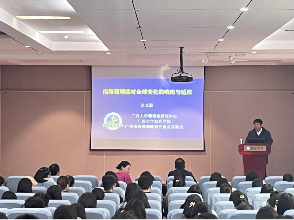 10月20日,应bat365正版唯一官网邀请,广西大学余克服教授在“贤林讲坛”为我校师生作题为“南海珊瑚礁对全球气候变化的响应与适应”的学术报告。我校青年教师、硕士研究生和本科生共200余人参加报告。报告会由bat365正版唯一官网院长牛继强教授主持。