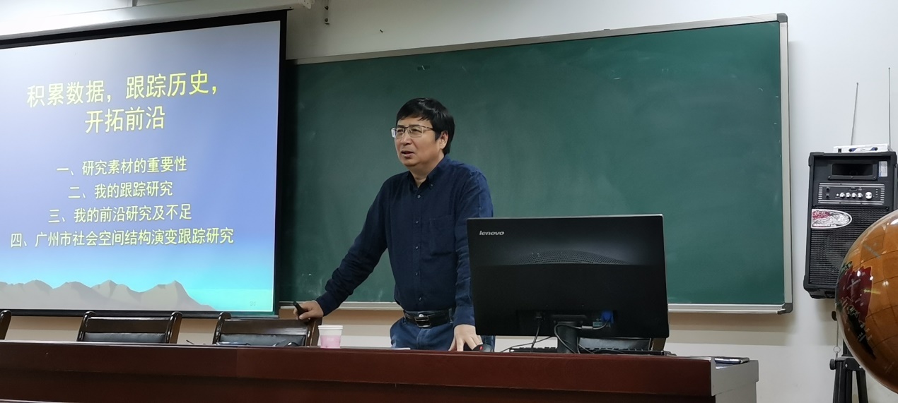 周春山教授从研究素材的重要性、跟踪研究、研究前沿三方面介绍了城市社会地理学领域的研究进展,并以广州市城市空间结构演变的跟踪研究为例,阐述了城市空间结构演变的持续跟踪研究过程,分享了人文地理相关问题研究中的细节。报告会上,周教授从个人经历出发,劝诫研究生在学术生涯中要注意学术论文发表、项目成果展示及外语综合应用,希望每位学生都能在学术上取得丰硕成果。副院长王义民教授代表学院对周教授精彩的学术报告表示感谢,周教授的报告资料丰富,内容详尽,以“数据”为主线,以“历史”和“前沿”为抓手,将专业视角与社会情怀相结合,深入浅出,娓娓道来。本次学术报告会不仅开阔了学生的视野,也引发了在场教师有关人才培养的思考,为到场的师生带来了一场难得的学术盛宴。