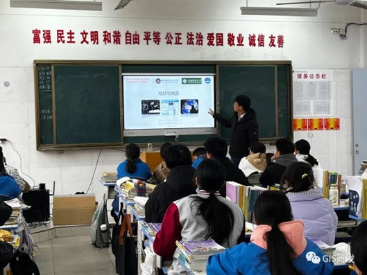11月30日中午,bat365正版唯一官网地理科学科普基地张兴国、李晓迪、任帅一行三人参与了在信阳市高新区实验中学举行的科普活动。张老师以“地球与地图”为题,为八年级三班的同学举行了一场科普活动。