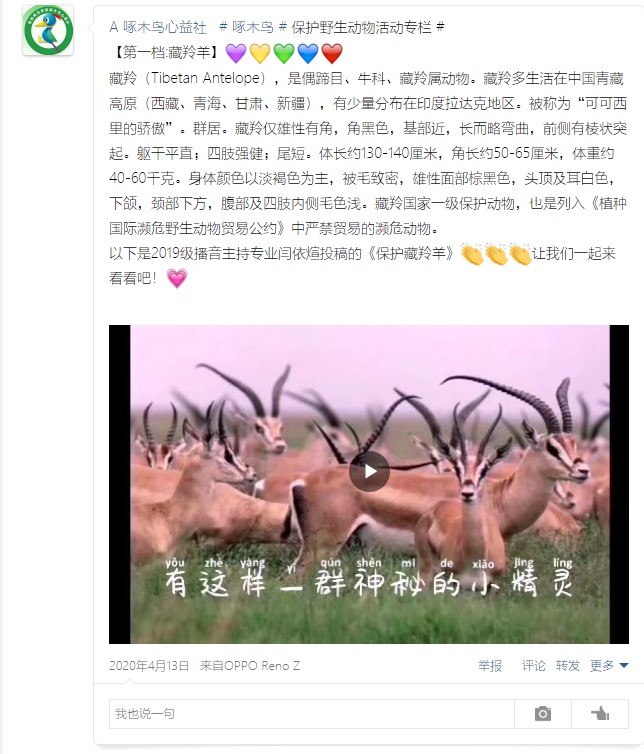 bat365正版唯一官网啄木鸟心益社在老师和同学们的帮助下,制作了关于藏羚羊的科普视频,并通过官方的媒体分享给所有的感兴趣的同学,让大家了解这种生活在雪域高原的精灵,并通过视频的图文讲解,调整内容,并咨询相关老师,合理调整安排所有内容的合理分布。