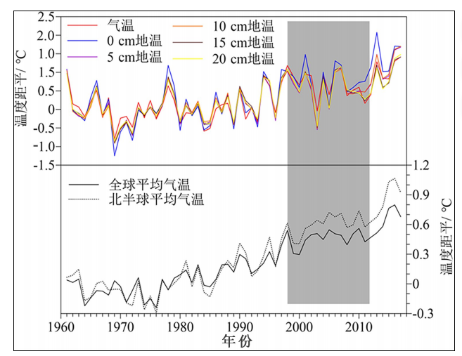 (4)1998—2012年淮河源年均地温除0cm 地层呈微弱升温趋势外,其余各层地温和气温均呈不显著降温趋势,对全球增暖停滞的响应极为敏感。