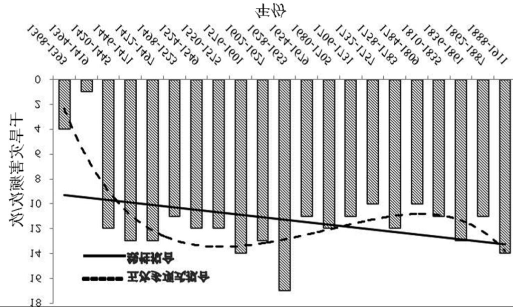 从图2可以看出:1420年(永乐十八年)之前,干旱灾害发生次数较少,共计5次;1420年(永乐十八年)至1653年(永历七年),共计发生干旱灾害117次,发生旱灾的频率显著增大;1654年(永历七年)至1861年(咸丰十一年),共计发生干旱灾害90次,发生旱灾的频率相对增大;1862年(咸丰十二年)之后,共计发生干旱灾害25次,发生的旱灾频率较大。