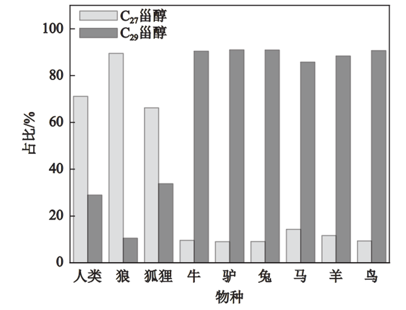 图2夏达错流域不同物种粪便中C27和C29甾醇占比