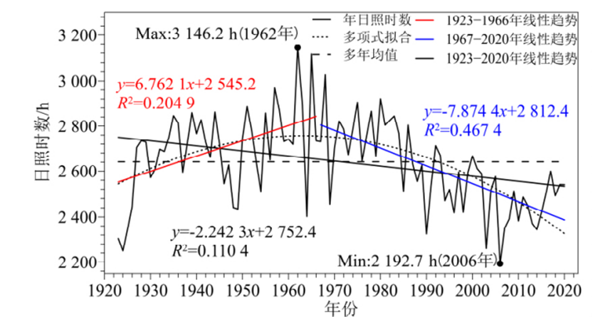 同时,研究者对1923-2020年北京市年日照时数的周期变化进行分析,发现存在56a(第一主周期)、36a(第二主周期)周期变化;且近百年北京市年日照时数于2000年发生突变,夏、秋和冬季日照时数突变年份分别为2001年、1992年和1983年,春季未检测到突变信号。