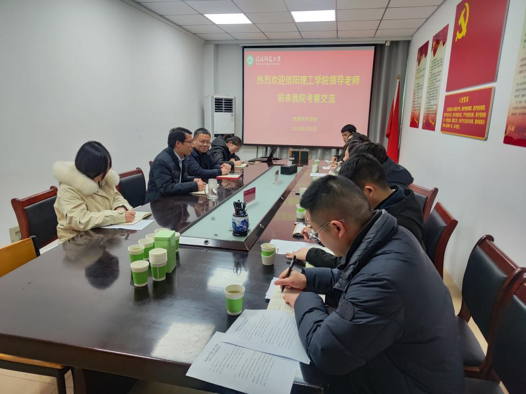 3月4日下午,信阳理工学院学生工作负责人耿晓菊带领全体专职辅导员一行8人莅临bat365考察交流,bat365党委副书记朱明、副院长颜俊及专职辅导员参加了座谈会。
