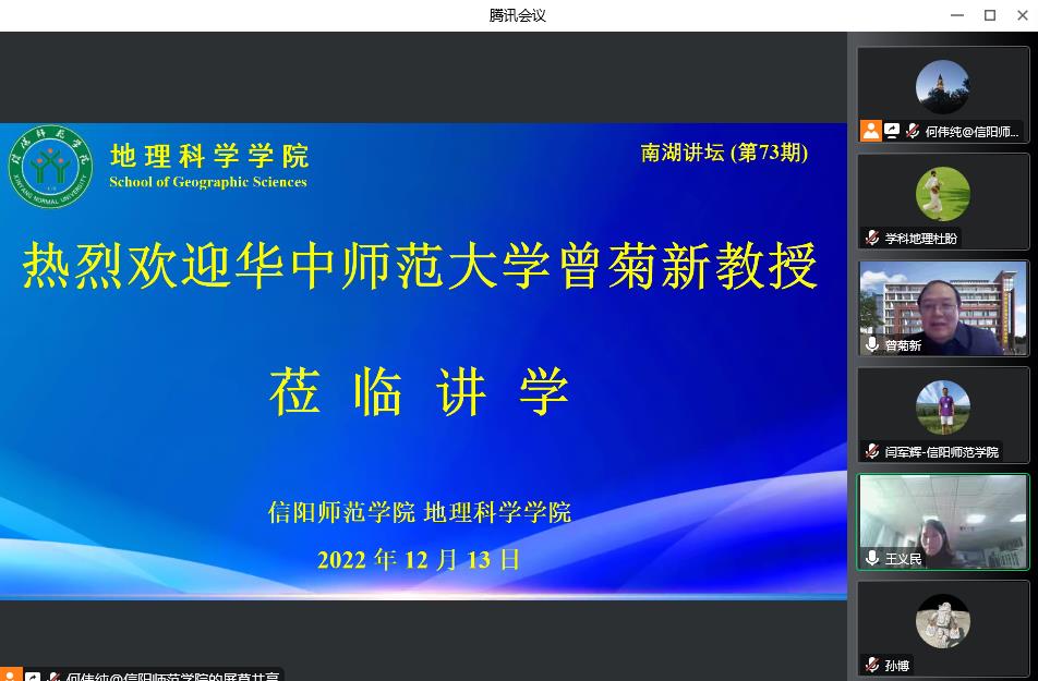 1213日下午,应bat365正版唯一官网邀请,华中师范大学曾菊新教授以腾讯会议平台的形式为bat365师生作了题为“敬畏自然:学苑论衡、政府导向及生态价值观研究”的学术报告。学院青年教师、硕士研究生和部分本科生150余人参加报告会,报告会由副院长王义民教授主持。